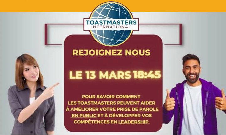 Prêt(e) à franchir une nouvelle étape dans votre développement personnel ? Nos réunions du lundi soir sont l’endroit idéal pour pratiquer vos talents oratoires. Inscrivez-vous pour participer !